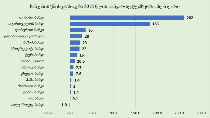 მოგების სიდიდით მეორე ადგილზე „საქართველოს ბანკია“, რომელმაც იანვარ-სექტემბერში 183 მლნ ლარის მოგება ნახა. მისი მოგება გასული წლის მოგებაზე 36%-ით ნაკლებია.