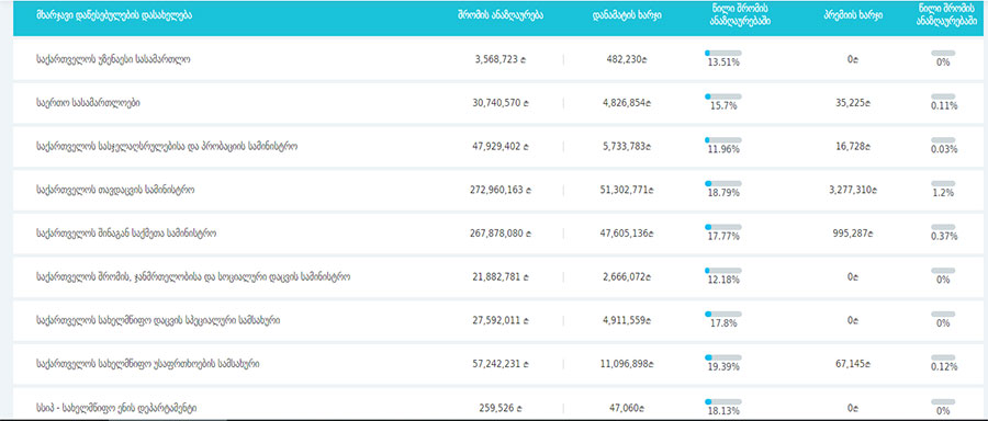 2018 წლის 9 თვეში საბიუჯეტო ორგანიზაციებმა შრომის ანაზღაურებაზე ჯამში მილიარდი ლარი დახარჯეს, აქედან თანამდებობრივი სარგოს ხარჯი 717.3 მლნ ლარი იყო.