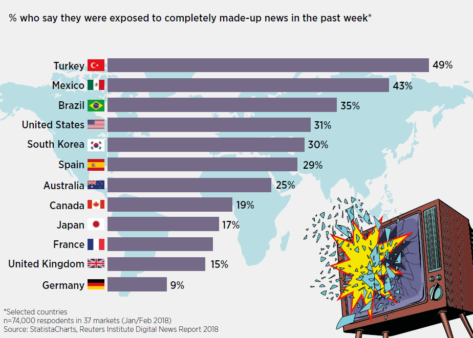 თურქეთის მოსახლეობა ყველაზე ხშირად ხვდება ე.წ. Fake ახალი ამბების გავლენის ქვეშ, – ასეთია Reuters-ის კვლევის შედეგები, რომლითაც მსოფლიოს სხვადასხვა ქვეყნებში მცდარ ინფორმაციაზე დამოკიდებულების მაჩვენებელი გაზომეს. შედეგად, თურქეთი პირველ ადგილზე აღმოჩნდა, რომლის გამოკითხული მოსახლეობის 49%-მა განაცხადა, რომ ბოლო ერთი კვირის განმავლობაში მსგავსი შემთხვევა ჰქონია. მეორე ადგილზეა მექსიკა 43%-ით, სამეულს კი ბრაზილია ასრულებს 35%-ით.