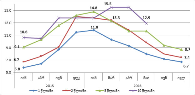 ბოლო ერთ თვეში 5 წლიანი ფასიანი ქაღალდების საპროცენტო განაკვეთი 0.7% პუნქტით შემცირდა. შემცირების ტენდენციაა სხვა ვადიანობის მქონე ფასიან ქაღალდებზეც (იხ. რაფიკი). საპროცენტო განაკვეთების შემცირება მონატარული პოლიტიკის განაკვეთის და ინფლაციის დონის შემცირებამ განაპირობა.