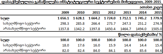 საქართველოს სტატისტიკის ეროვნული სამსახურის ინფორმაციით, 2015 წელს სახელმწიფო სექტორში დასაქმებულთა რიცხი 23.7 ათასით გაიზარდა და 275 ათასი შეადგინა. ჯამში, სახელმწიფო სექტორში დასაქმებულია დასაქმებულთა 15.4%. არასახელმწიფო სექტორში დასაქმებულთა რაოდენობა 11.1 ათასით გაიზარდა და 1 505 ათასი შეადგინა. უნდა აღვნიშნოთ, რომ არასახელმწიფო სექტორში დასაქმებულებიდან 1 018 ათასი თვითდასაქმეულია. შესაბამისად, თუ მხოლოდ დაქირავებით დასაქმებულების სტატისტიკას ვნახავთ, სახელმწიფო სექტორში დასაქმების წილი 56 პროცენტია.