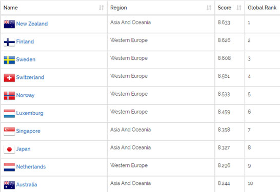 რეიტინგში პირველ ადგილზე ახალი ხელანდიაა, ხოლო ბოლო – 127-ე ადგილზე იემენის რესპუბლიკაა.
