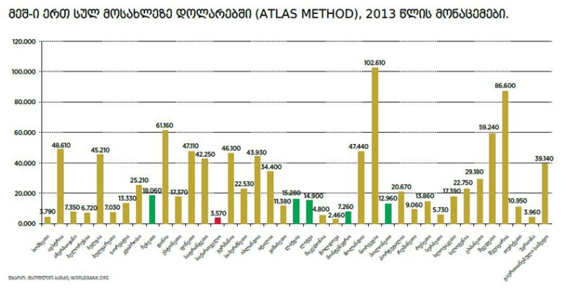 2013 წელს საქართველოს მეშ ერთ სულ მოსახლეზე – 3,570$-ია და ამ მაჩვენებლით ის დაბალ-საშუალო შემოსავლის (განვითარებადი) მქონე ქვეყნების ჯგუფს მიეკუთვნება. რაც შეეხება საშუალო ევროპული დონის ქვეყნებს, მათ მაჩვენებლად შემდეგი ქვეყნებია აღებული: მონტენეგრო (ზედა-საშუალო შემოსავლის მქონე ქვეყანა), ლატვია, ლიტვა, პოლონეთი და ჩეხეთი, რომლებიც მაღალი შემოსავლის მქონე ქვეყნებს მიეკუთვნება, თუმცა ისინი ამ ჯგუფში უკანა პლანზე იმყოფებიან; შესაბამისად, ეს ქვეყნები სტატიაში საშუალო ევროპული დონის ქვეყნებადაა განხილული.