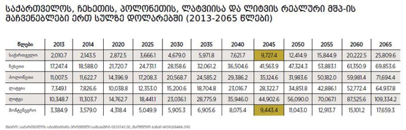 2013 წელს ყველაზე მაღალი მშპ – ერთ სულზე (სტატიაში განხილული 5 ქვეყნიდან) ჩეხეთს აქვს – 17 247, 4 დოლარის ოდენობით, მეორე ადგილი პოლონეთს უკავია – $11 007,5, მესამეზე ლიტვა დგას – $10 348,9, მეოთხეზე ლატვია – $7 349,1; მეხუთეზე მონტენეგრო – $3 384,9 და ბოლოზე საქართველო – $2 010,7. ცხრილიდან ცხადია, რომ დაახლოებით 50 წლის შემდეგ – 2065 წლისთვის – საქართველოს მშპ ერთ სულზე $25 809,6-ზე დაფიქსირდება, რაც მხოლოდ მონტენეგროს მაჩვენებელს – $17 659,3-ს აღემატება. მიუხედავად იმისა, რომ ჩვენ მიერ განხილული ყველა ევროპული ქვეყნის ეკონომიკური ზრდა საქართველოს ეკონომიკის ზრდაზე ნაკლებია, ჩვენი ქვეყანა 5%-იანი ზრდით ამ ქვეყნებს ნახევარ საუკუნეშიც კი ვერ დაეწევა; ერთადერთი გამონაკლისი მონტენეგროა, რომელსაც საქართველო 2044 წელს გაუსწრებს; ამ წელს საქართველოს მშპ ერთ სულზე – $9 264,2-ზე, ხოლო მონტენეგროსი კი $9 152,4-ზე დაფიქსირდება. აქედან ნათელია, რომ საქართველოს ეკონომიკა 5%-იანი ზრდით, სტატიაში განხილული ევროპის 5 ქვეყნიდან მხოლოდ მონტენეგროს, ისიც 30 წელიწადში გაუსწრებს. 2065 წლისთვის ყველაზე მაღალი მშპ ერთ სულზე ლიტვას აქვს $109 334,2-ის ოდენობით, შემდეგ პოლონეთს – $71 694,4, ჩეხეთს – $69 853,6, ლატვიას – $64 937,8, საქართველოს – $25 809,6, დაბოლოს მონტენეგროს – $17 659,3.