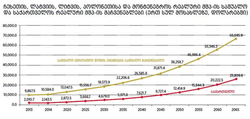 2013 წელს ცხრილში განხილული 5 ევროპული ქვეყნის საშუალო რეალური მშპ ერთ სულზე $9 867,5-ია, რაც საქართველოს მაჩვენებელ $2 010,7-ზე დაახლოებით 4,9-ჯერ მეტია. თუ საქართველოს ეკონომიკური ზრდა 50 წლის განმავლობაში 5%-ია, ევროპული ქვეყნების საშუალო ზრდა 3,64%-ია. მიუხედავად იმისა, რომ 3,64%-ი 5%-ზე ნაკლებია, 2065 წლისთვის ევროპული ქვეყნების საშუალო რეალური მშპ ერთ სულზე – $66 695,9 საქართველოს მაჩვენებელ – $25 809,6-ზემაინც 2,6-ჯერ მეტია, რაც კიდევ ერთხელ ადასტურებს გრძელვადიან პერიოდში საქართველოს ეკონომიკის 5%-იანი ზრდის არაეფექტიანობას.