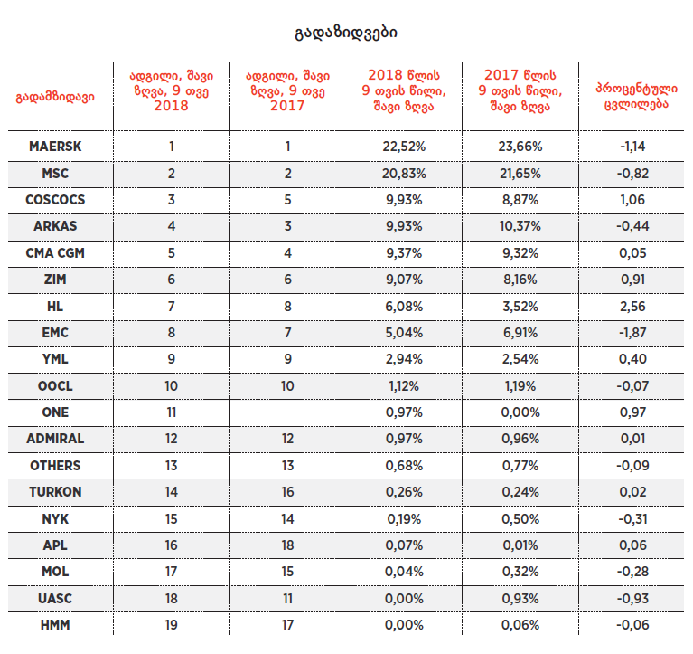 შავი ზღვის რეგიონის ლიდერ საზღვაო ხაზად ტრადიციულად რჩება MAERSK-ი, მას მოსდევს MSC, ხოლო მესამე ადგილი ნაცვლად ARKAS-ისა და CMA CGM-ისა, დაიკავა COSCO-მ, თუმცა აღსანიშნავია, რომ განსხვავებამ COSCO-სა და ARKAS-ს შორის სულ რაღაც 4 TEU შეადგინა. ჯამურად აღნიშნული საზღვაო ხაზების მიერ კონტროლირდება შავი ზღვის საკონტეინერო ბაზრის 72%. MAERSK-ისა და MSC-ის ჯამური საბაზრო წილი 2017 წელს შეადგენდა 45,3%-ს, მაგრამ 2018 წლის პირველი ცხრა თვის მონაცემებით ეს წილი შემცირდა 2%-ით და შეადგინა 43,3%.