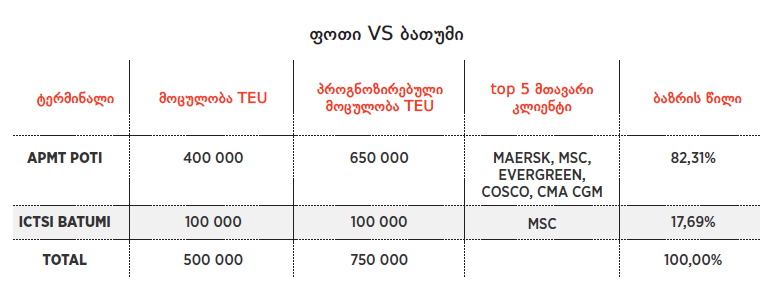 ქართული საკონტეინერო ბაზარი რეგიონში წარმოდგენილია ფოთისა და ბათუმის პორტებით, ხოლო მათგან უმსხვილეს მოთამაშეს წარმოადგენს ფოთის პორტი, რომელიც „ეი-პი-ემ ტერმინალსის“ საკუთრებაშია, 15 ნავმისადგომი გააჩნია 8,5 მეტრის სიღრმითა და 250-მეტრიანი საკონტეინერო ტერმინალით, რომლის წლიური გამტარუნარიანობა ამჟამად 400 000 TEU-ს შეადგენს, აღნიშნულ პორტში ოპერირებს ყველა წამყვანი საზღვაო კორპორაცია, რომელიც შავ ზღვაშია წარმოდგენილი. ფოთის საზღვაო პორტის შემავსებელ საზღვაო საპორტო ინფრასტრუქტურად საკონტეინერო გადაზიდვებში შავ ზღვაზე გამოყენებულია ბათუმის ნავსადგური, რომლის მაქსიმალური გამტარუნარიანობა ოთხჯერ ჩამორჩება წინამორბედისას და შეადგენს 100 000 TEU-ს წელიწადში, ამდენად ამ უკანასკნელში ოპერირებს მხოლოდ ერთი საკონტეინერო ხაზი. ჯამურად, 2018 წლის პირველი სამი კვარტალის მონაცემებით, საქართველოს უკავია შავი ზღვის საკონტეინერო ბაზრის 14%-მდე წილი.