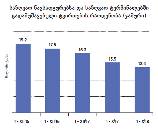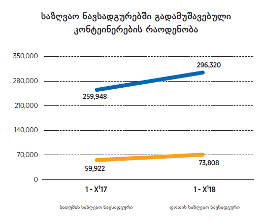 თუკი გავაანალიზებთ საზღვაო ნავსადგურებსა და საზღვაო ტერმინალებში გადამუშავებული ტვირთების ჯამური მოცულობების ტრენდს ტონებში უკანასკნელი ხუთი წლის განმავლობაში, ვნახავთ, რომ კლებადი ხასიათით გამოირჩევა. 2015 წლიდან 2018 წლის ჩათვლით საშუალოდ ყოველწლიურად 1%-იანი შემცირება ფიქსირდება. თუმცა, თუკი შევხედავთ ტვირთზიდვის რაოდენობას საკონტეინერო ერთეულში ფოთისა და ბათუმის ნავსადგურების მაგალითზე, დავინახავთ, რომ ფოთის პორტის შემთხვევაში 2017 წლის პირველი ათი თვის მონაცემი 259,948 TEU გაიზარდა 296,320 ერთეულამდე 2018 წლის ანალოგიური პერიოდისთვის. ასევე ბათუმის პორტში 2017 წლის პირველი ათი თვის ჯამური მონაცემით სულ გადამუშავებულ იქნა 59,922 TEU და ეს მოცულობა მომდევნო წლის ანალოგიურ პერიოდში 13,886 ერთეულით გაიზარდა.