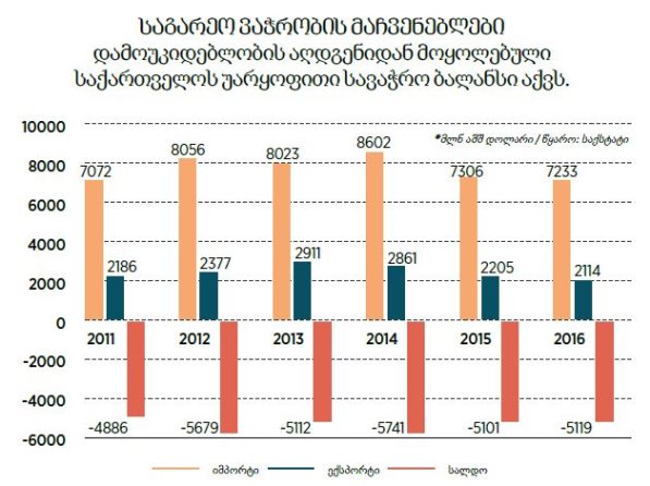 დამოუკიდებლობის აღდგენიდან მოყოლებული საქართველოს უარყოფითი სავაჭრო ბალანსი აქვს, ანუ იმპორტი აღემატება ექსპორტს. 2016 წელს საქართველოს იმპორტმა მშპ-ის მიმართ 52% შეადგინა, ხოლო ექსპორტმა – 15%. ნომინალურ გამოსახულებაში, 2016 წელს უარყოფითი სავაჭრო ბალანსი 5.1 მილიარდი დოლარი (მშპ-ის 36%) იყო. ეს ნიშნავს, რომ საქონლით საგარეო ვაჭრობის შედეგად, საქართველოდან 5.1 მილიარდი დოლარით მეტი გავიდა, ვიდრე შემოვიდა. ასეთი მაღალი მოცულობის უარყოფითი სავაჭრო ბალანსი საქართველოს წინაშე დღეს არსებული მწვავე პრობლემის – ლარის გაუფასურების ერთ-ერთ მთავარ მიზეზად იქცა. აქედან გამომდინარე, პოპულარული გახდა აზრი იმპორტის ხელოვნურად შემცირების შესახებ, რაც მცდარი მიდგომაა. პრობლემა ის კი არ არის, რომ იმპორტი საქართველოს მშპ-ის 52%-ია, პრობლემა ისაა, რომ ექსპორტი არის მცირე – მშპ-ის 15%. იმპორტის ხელოვნურად შემცირება (მაგალითად, იმპორტირებულ პროდუქციაზე გადასახადების ზრდით) ნიშნავს, რომ ფასის მატებით, მომხმარებელს ვაიძულებთ, ნაკლები იმპორტირებული პროდუქცია შეიძინოს, რაც მოქალაქეების ეკონომიკურ მდგომარეობას გააუარესებს. ქვეყნის ეკონომიკის მიმართ იმპორტის 52% რომ ეკონომიკური პრობლემების სათავე არ არის, ამას მოწმობს თუნდაც ბალტიისპირეთის ქვეყნების საგარეო ვაჭრობის მაჩვენებლები. ესტონეთში იმპორტი ქვეყნის მშპ-ის 85%-ია, ლიტვაში – 79%, ლატვიაში – 63%.