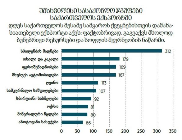 საქართველოს ექსპორტში პირველ ადგილზე (312 მლნ დოლარით) სპილენძის მადნები და კონცენტრატებია, რაც რეალურად რეექსპორტია. ასევე რეექსპორტია მეოთხე (167 მლნ დოლარით) ადგილზე მყოფი მსუბუქი ავტომობილების ექსპორტი და მეექვსე ადგილზე (107 მლნ დოლარით) მყოფი სამკურნალო საშუალებების ექსპორტი. ადგილობრივი წარმოების პროდუქტებიდან პირველი ადგილი თხილისა და კაკლის ექსპორტს უჭირავს 179 მლნ დოლარით. შემდეგ მოდის ფეროშენადნობები 169 მლნ დოლარით და ღვინო 113 მლნ დოლარით.