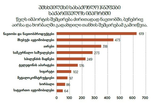 საქართველოს იმპორტში პირველ ადგილზე (619 მლნ დოლარით) ნავთობი და ნავთობპროდუქტებია. მეორე ადგილზე (473 მლნ დოლარით) მსუბუქი ავტომობილების იმპორტია, რომლის მნიშვნელოვანი ნაწილი რეექსპორტზე გადის. მესამე ადგილზე (318 მლნ დოლარით) ბუნებრივი და სხვა აირების იმპორტია.