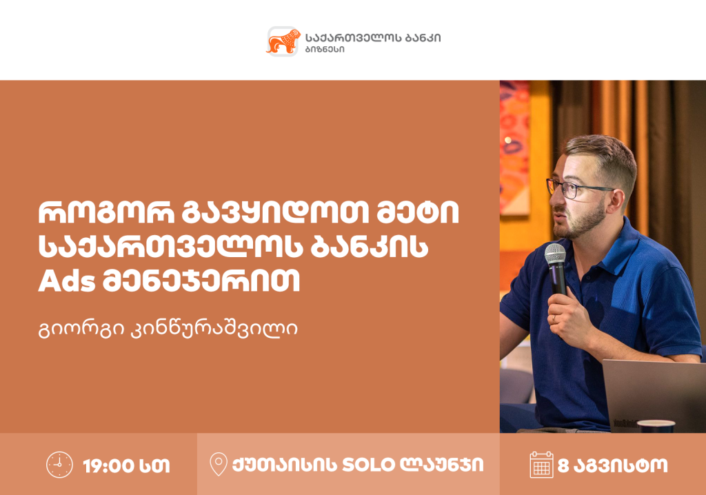 საქართველოს ბანკი აგრძელებს მცირე და საშუალო ბიზნესისთვის ახალი შესაძლებლობების გაზიარებას. Ads მენეჯერის საზაფხულო ვორკშოპების სერიის ფარგლებში, ამჯერად მესამე შეხვედრა ბიზნესის წარმომადგენლებთან 8 აგვისტოს, 19:00 საათზე ქუთაისში, SOLO ლაუნჯში გაიმართება. შეხვედრას საქართველოს ბანკის ციფრული საბანკო ეკოსისტემების სამსახურის ხელმძღვანელი გიორგი კინწურაშვილი გაუძღვება და აუდიტორიას გაუზიარებს პრაქტიკულ რჩევებს, თუ როგორ შეუძლიათ შექმნან ფასდაკლების, ქეშბექის ან PLUS ქულის შეთავაზება, რომელიც მობილბანკში, Offers.bog.ge-სა და sCoolApp-ში გამოჩნდება.