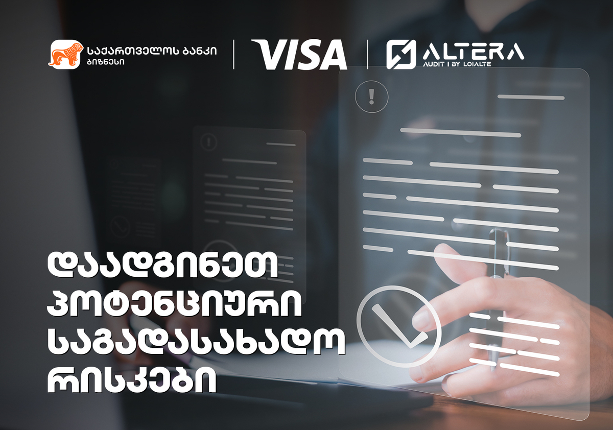 „საქართველოს ბანკი ბიზნეს მომხმარებლებს სთავაზობს მათ საჭიროებებზე მორგებულ მომსახურებას და სერვისებს ჩვენი პარტნიორი კომპანიებისგან. ამჯერად, ALTERA ბიზნეს მომხმარებლებს ერთჯერად მომსახურებას გაუწევს. Alter Audit-ი უნიკალური პროგრამული უზრუნველყოფაა აუდიტორული და საკონსულტაციო კომპანია Loialte-სგან, რომელიც კომპანიის საგადასახადო რისკებს აიდენტიფიცირებს, განსაზღვრავს საგადასახადო შემოწმების ალბათობას და მომხმარებლებს აძლევს რეკომენდაციებს ფინანსური აღრიცხვის კუთხით“, – აღნიშნავს საქართველოს ბანკის მცირე და საშუალო ბიზნესის დამატებითი ღირებულების სერვისების განვითარების დეპარტამენტის დირექტორი, რუსუდან ბარათაშვილი.