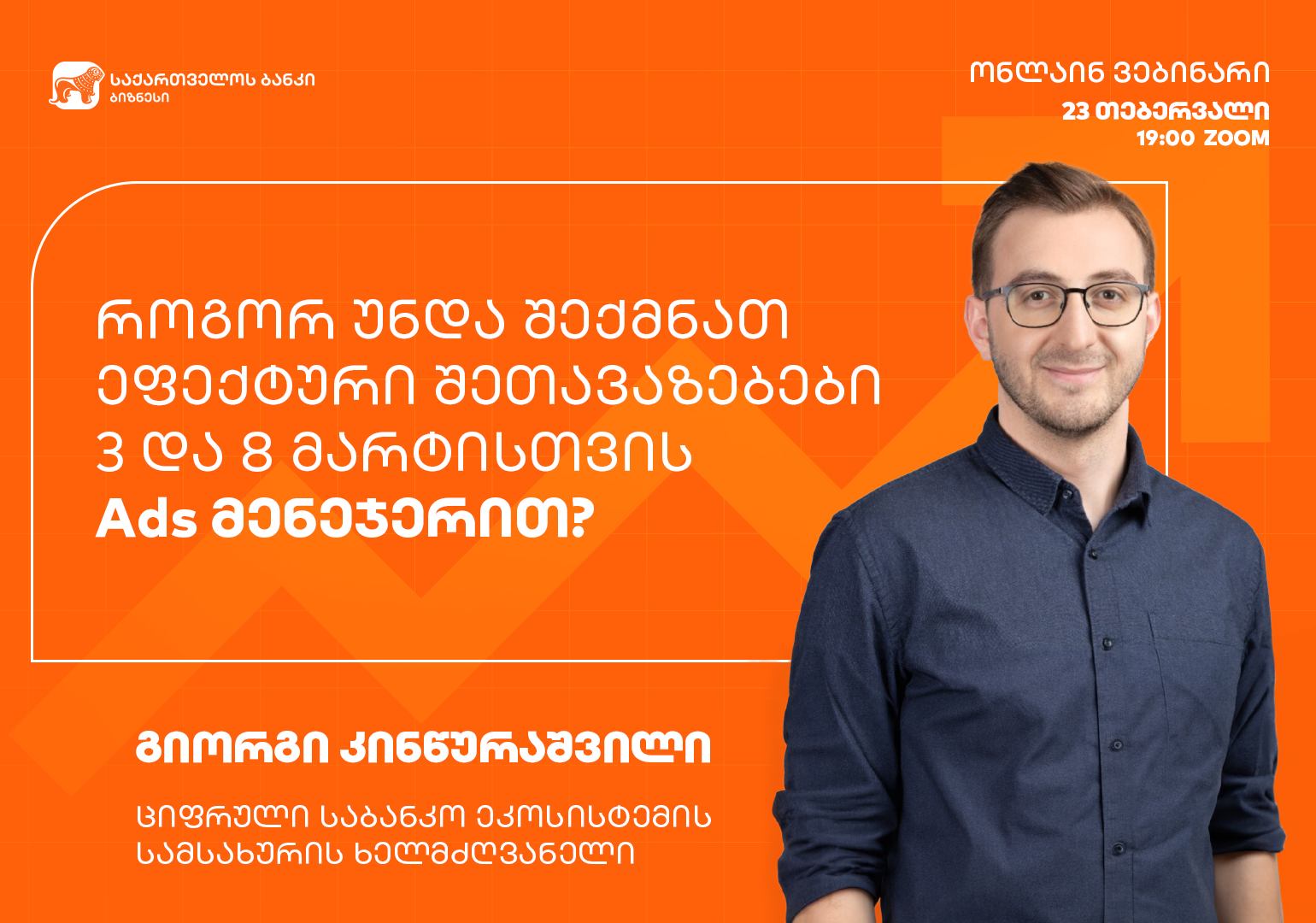 „ჩვენთვის მნიშვნელოვანია ბიზნეს მომხმარებლებს შევთავაზოთ ისეთი ინოვაციური პროდუქტები, რომელიც ხელს შეუწყობს მათი ბიზნესის ზრდას და განვითარებას. შეთავაზების მართვის ახალი პლატფორმა – Ads მენეჯერი საქართველოს ბანკის ახალი პროდუქტია, რომელიც რამდენიმე თვის წინ შევთავაზეთ ჩვენს მომხმარებლებს და ის ბიზნესებს მონაცემებზე დაფუძნებით გადაწყვეტილებების მიღების საშუალებას აძლევს. Ads მენეჯერის და სასაჩუქრე ბარათების გამოყენება ახლა განსაკუთრებით აქტუალურია, რადგან გაზაფხულის დღესასწაულები ახლოვდება და კიდევ უფრო მეტი ადამიანი ელოდება მათთვის საინტერესო შეთავაზებებს. ვებინარზე ვისაუბრებთ Ads მენეჯერის ყველა იმ შესაძლებლობაზე, რაც ბიზნეს მომხმარებლებისთვის 1 სივრცეში არის ხელმისაწვდომი, როგორ უნდა გამოიყენონ ის. ეს კიდევ ერთი კარგი ინსტრუმენტია მათთვის, ვინც საკუთარი ბიზნესისთვის ახალ შესაძლებლობებს ეძებს“, – განაცხადა გიორგი კინწურაშვილმა, საქართველოს ბანკის ციფრული საბანკო ეკო სისტემის სამსახურის უფროსმა.