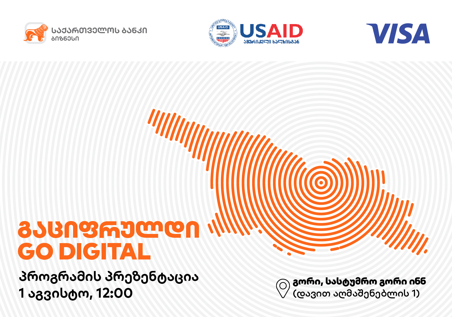 პროგრამის პრეზენტაცია გორში, 1 აგვისტოს, 12:00 საათზე, სასტუმრო გორი ინნ-ში შედგება. შეხვედრაზე რეგიონულ ბიზნესები გაიგებენ, თუ როგორ შეუძლიათ ბიზნესთან დაკავშირებული ყოველდღიური პროცესების გაციფრულება, ონლაინ მართვის სისტემების დანერგვა და ფინანსური პროცესების მოწესრიგება.
