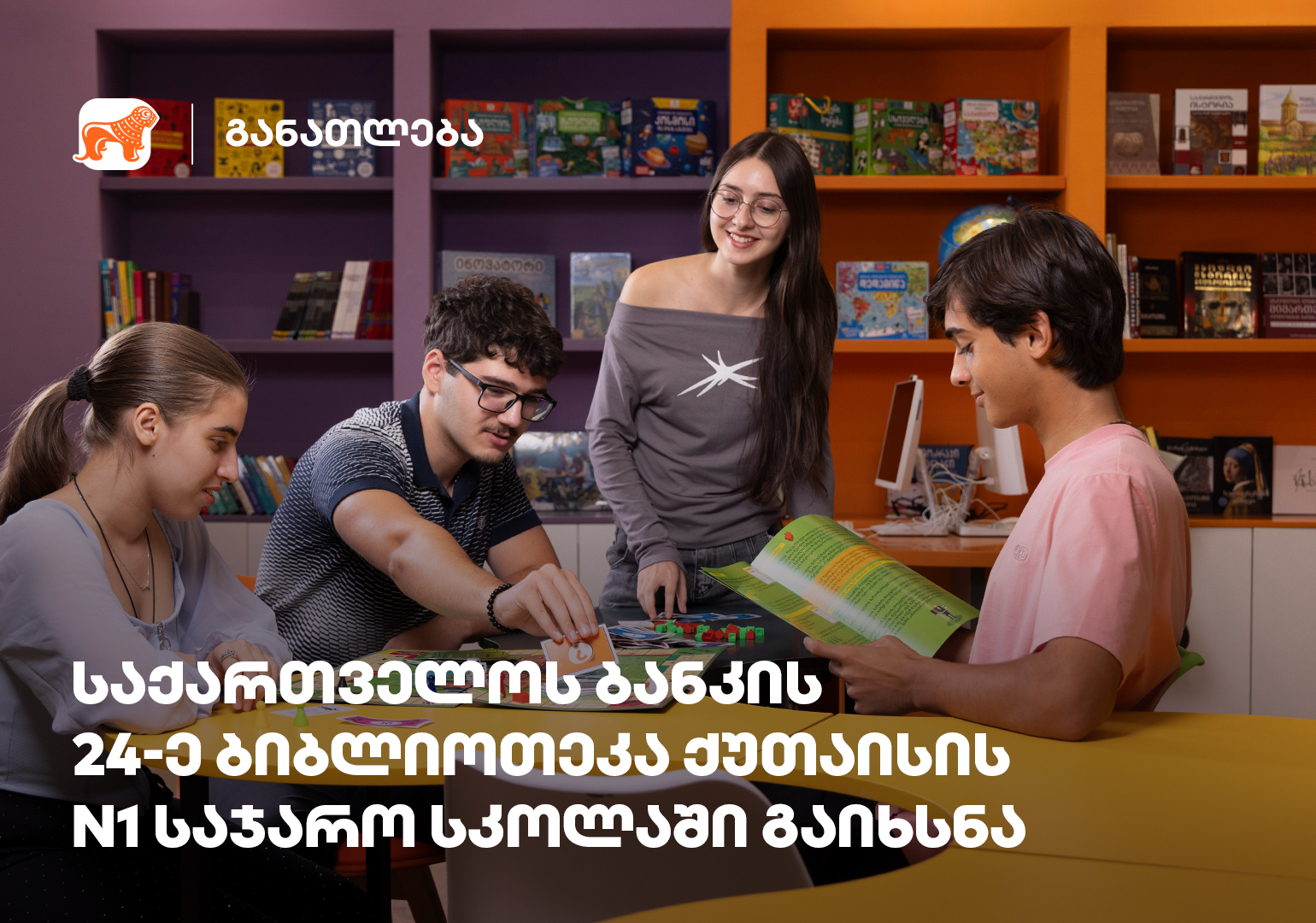 საქართველოს ბანკის რიგით 24-ე ბიბლიოთეკა ქუთაისის N1 საჯარო სკოლაში გაიხსნა, რაც სკოლის 1700-ზე მეტ მოსწავლეს აძლევს შესაძლებლობას, ახალი აღმოჩენებისა და შემეცნების სივრცეში მნიშვნელოვანი ნაბიჯები გადადგან.