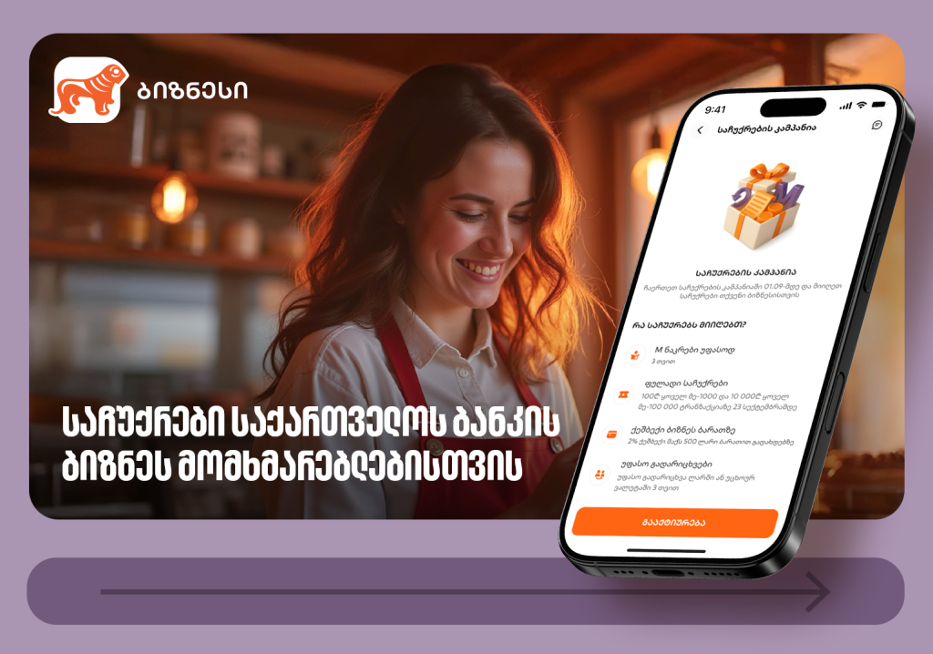 საქართველოს ბანკი აქტიურად აგრძელებს ინოვაციური ციფრული სერვისების განვითარებას და ბიზნესმომხმარებლებისთვის საბანკო მომსახურებაზე წვდომის გამარტივებას. კამპანიის შესახებ დამატებითი დეტალების მისაღებად ეწვიეთ ბმულს.