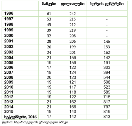 ცხრილი – საქართველოში მოქმედი კომერციული ბანკების, მათი ფილიალების და სერვის-ცენტრების რაოდენობა: