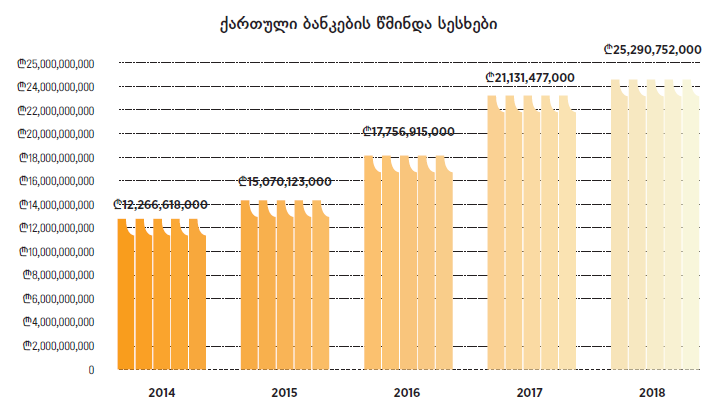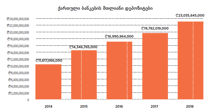 2018 წელს საქართველოს საბანკო სექტორში განთავსებულმა დეპოზიტებმა 23 მილიარდ ლარს მიაღწია, რაც წინა წელთან შედარებით 16.4%-ით მეტია. წმინდა სესხების მოცულობა კი 25.3 მილიარდი ლარია, რაც 2017 წელთან შედარებით 19%-ით მეტია. ჯამურად საბანკო სექტორის აქტივების ზომა 40 მილიარდს აღწევს, ბანკების სააქციო კაპიტალის ზომა კი 5.1 მილიარდ ლარს.
