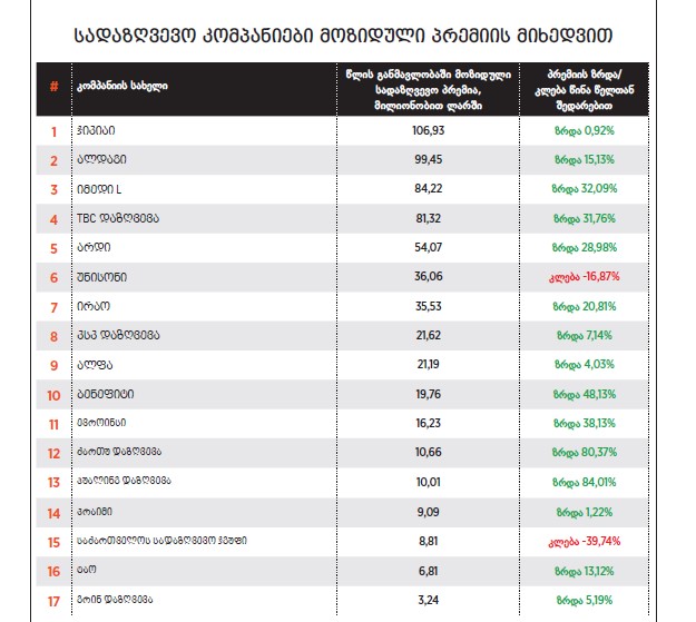 რაც შეეხება სადაზღვევო სფეროს წმინდა მოგებას, ის გასულ წელს 40%-ით, 25 მილიონ ლარამდე შემცირდა. ქვეყანაში არსებულმა ყველა სადაზღვევო კომპანიამ საკუთარი ფინანსური შედეგები სფეროს მარეგულირებელს – სსიპ დაზღვევის ზედამხედველობის სახელმწიფო სამსახურს უკვე წარუდგინა. აღნიშნული მონაცემების მიხედვით, ბაზრის ლიდერი მოზიდული პრემიის ოდენობით 2018 წლის მსგავსად “ჯიპიაი ჰოლდინგია”. ზრდის მიხედვით კი 10 მილიონ ლარზე მეტად გასულ წელს მხოლოდ ოთხი კომპანიის – “TBC დაზღვევის”, “არდის“ “ალდაგისა” და “იმედი L”-ის მიერ მოზიდული პრემიის მოცულობა გაიზარდა.