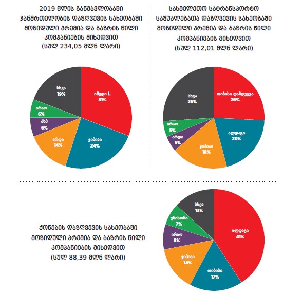 სადაზღვევო სექტორის სამ ყველაზე შემოსავლიან ბაზარზე კომპანიების მიხედვით წილები ასე ნაწილდება: