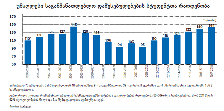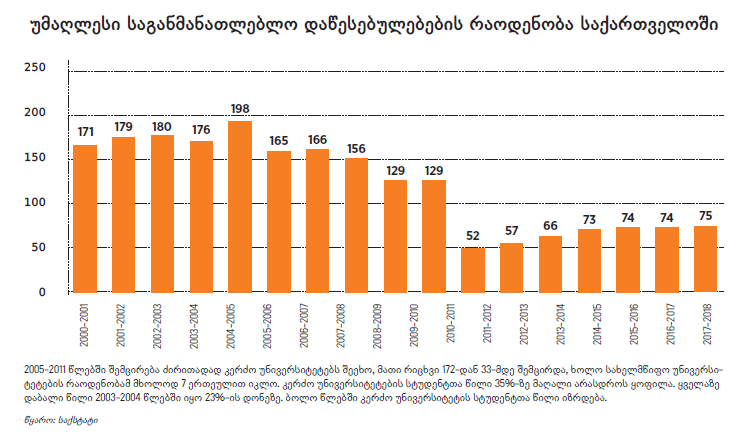 საქართველოს სტატისტიკის ეროვნულ სამსახურს უმაღლესი სასწავლებლებისა და სტუდენტების შესახებ ინფორმაცია 2000-2001 სასწავლო წლიდან აქვს გამოქვეყნებული. 2000 წელს საქართველოში 171 უმაღლესი სასწავლებელი იყო, სადაც 110 287 სტუდენტი სწავლობდა. მიუხედავად იმისა, რომ სასწავლებლების რაოდენობა 75-მდე შემცირდა, მათში 30%-ით მეტი სტუდენტი სწავლობს, ვიდრე 17 წლის წინ. 2004 წლამდე უნივერსიტეტების რაოდენობა მატულობდა და 2004-2005 სასწავლო წლისთვის უკვე 198 სასწავლებელი იყო, სადაც 145 452 სტუდენტი სწავლობდა.