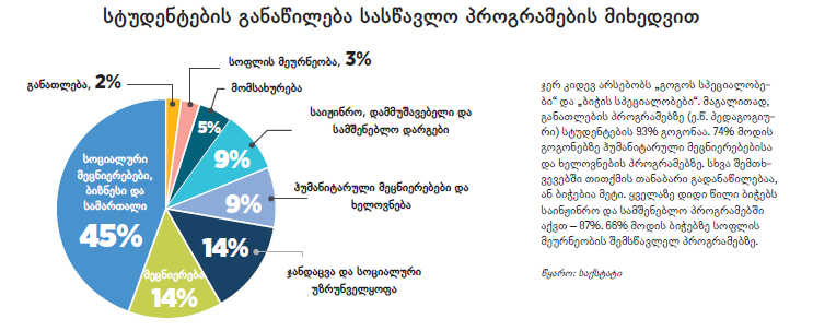 ყველაზე მოთხოვნადი პროგრამები სოციალური მეცნიერებები, ბიზნესი და სამართალია, სადაც ჯამში სტუდენტების 45% სწავლობს (64 379 სტუდენტი). შემდეგ მოდის მეცნიერება, სადაც დაახლოებით 20 000 სტუდენტი სწავლობს, ცოტათი ნაკლები სწავლობს ჯანდაცვისა და სოციალური უზრუნველყოფის პროგრამებზე. ყველაზე ცოტა, 2%, განათლების პროგრამებზე სწავლობს. ცალკე აღებულ კერძო უნივერსიტეტებში სოციალურ მეცნიერებებზე, ბიზნესსა და სამართალზე სტუდენტების 62% სწავლობს. შემდეგ ყველაზე მოთხოვნადი სამედიცინო პროგრამებია. როგორც კერძო, ისე სახელმწიფო უნივერსიტეტებშიც ყველაზე ნაკლები მოთხოვნა განათლების პროგრამებზეა. სახელმწიფო უნივერსიტეტებში სოციალური მეცნიერებების, ბიზნესისა და სამართლის პროგრამების შემდეგ ყველაზე მეტი სტუდენტი მეცნიერებების შემსწავლელ პროგრამებს ირჩევს.