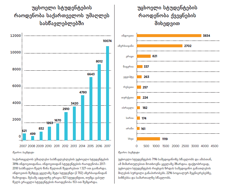 საქართველოს უმაღლეს სასწავლებლებში უცხოელი სტუდენტების რიცხვი სწრაფად იზრდება. ამის მიზეზი საქართველოში უმაღლესი განათლების სიიაფე და ლიბერალური სავიზო რეჟიმია. 2017-2018 სასწავლო წელს საქართველოში უმაღლეს განათლებას 10 074 უცხოელი სტუდენტი იღებდა, რაც 2 062 სტუდენტით მეტია 2016 წლის მაჩვენებელზე. 10 წლის წინ საქართველოში მხოლოდ 621 უცხოელი სტუდენტი სწავლობდა, გასულ წელს კი 16-ჯერ მეტი. მათი რაოდენობა 2014 წელთან შედარებითაც კი გაორმაგებულია. უცხოელი სტუდენტების 69% ბიჭია.