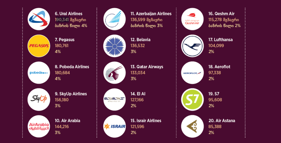 საქართველოში მოქმედი ავიაკომპანიების პირველი ოცეული გადაყვანილი მგზავრების რაოდენობის მიხედვით: