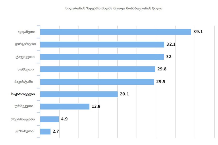 აზიის განვითარების ბანკის (ADB) მონაცემებით, საქართველოში სიღარიბის ზღვარს მიღმა მყოფი მოსახლეობის წილი 20,1%-ია, რაც მეზობელ სომხეთზე 8,7%-ით ნაკლები, ხოლო აზერბაიჯანზე 15,2%-ით მაღალი მაჩვენებელია.