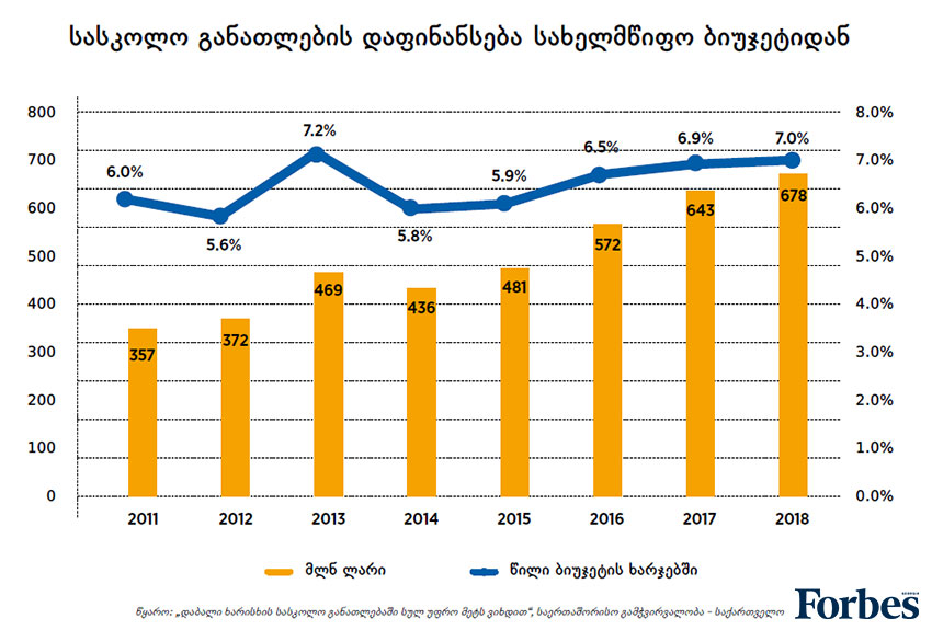 თბილისში, კერძო სკოლაში ერთი მოსწავლისთვის ხარისხიანი განათლების მისაცემად წლიურად მინიმუმ 2 000 ლარი არის საჭირო. მოსწავლეთა კვებით და საღამოს საათებამდე გახანგრძლივებული სწავლებით კი ერთ მოსწავლეზე მინიმალური ხარჯი 3 000 ლარამდე იზრდება. 2018 წელს საჯარო სკოლებში სახელმწიფო ბიუჯეტიდან ერთი მოსწავლის დაფინანსება საშუალოდ 1 123 ლარია. ყველა საჯარო სკოლაში მოსწავლეების წლიური დაფინანსება 2 000 ლარამდე რომ გაიზარდოს, სახელმწიფო ბიუჯეტიდან სასკოლო განათლების დაფინანსებას 529 მლნ ლარი უნდა დაემატოს.