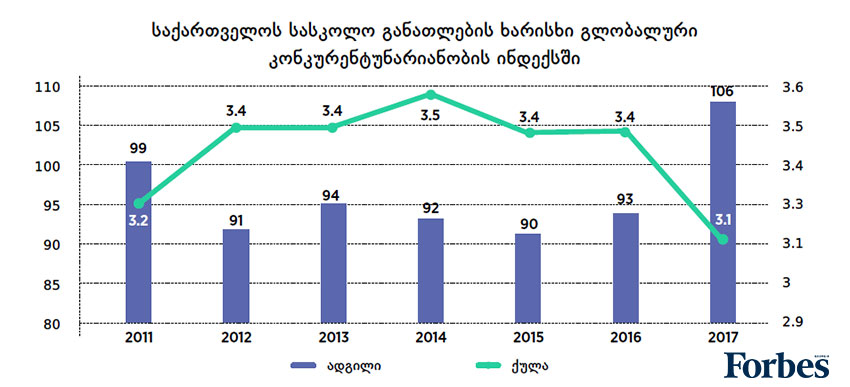 სასკოლო განათლების ხარისხზე დაკვირვებას მოიცავს მსოფლიო ეკონომიკური ფორუმის (WEF) გლობალური კონკურენტუნარიანობის ანგარიშიც. 2017-2018 წლების ანგარიშის მიხედვით, 137 ქვეყანას შორის სასკოლო განათლების ხარისხით საქართველო 106-ე ადგილზეა. აღნიშნულ კვლევაში განათლების ხარისხის განსაზღვრა დამსაქმებლების გამოკითხვით ხდება. რეიტინგში საქართველო ყველაზე კარგ პოზიციაზე 2015 წელს იყო – 90-ე ადგილზე, ხოლო ყველაზე მაღალი ქულა – 3.5 (მაქსიმალურია 7) 2014 წელს ჰქონდა. 2017 წელს შედეგები რადიკალურად გაუარესდა.
