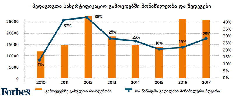 მიუხედავად იმისა, რომ სასერტიფიკაციო გამოცდის ჩაბარება ხელფასის მატების მნიშვნელოვანი წინაპირობაა, 2017 წლის მდგომარეობით პედაგოგთა მხოლოდ 30%-ს ჰქონდა თუნდაც ერთი სასერტიფიკაციო გამოცდა ჩაბარებული. 2010-2017 წლებში სასერტიფიკაციო გამოცდებზე გასულ პედაგოგთა 75%-მა საკუთარ საგანში მინიმალური ზღვარი ვერ გადალახა. საქართველოშო სულ 67 ათასამდე პედაგოგია, საიდანაც დაახლოებით 45 ათასს სასერტიფიკაციო გამოცდა ჩაბარებული არა აქვს. ისინი ან არ გასულან გამოცდაზე, ან ჩაიჭრნენ. ბოლო 3 წელიწადში სერტიფიცირებულ პედაგოგთა წილი მხოლოდ 3% პუნქტით გაიზარდა.
