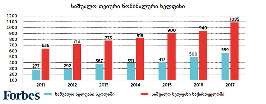 საინტერესოა, რომ საჯარო და კერძო სკოლებში დასაქმებულთა ხელფასებს შორის მნიშვნელოვანი სხვაობა არ არის. 2017 წელს კერძო სკოლებში საშუალო ხელფასი 15%-ით მეტი (თვეში 631 ლარი) იყო. 2012 წელს კერძო სკოლებში დასაქმებულთა ხელფასი საჯარო სკოლებში დასაქმებულთა ხელფასებს 35%-ით აღემატებოდა. 2013-2017 წლებში საჯარო სკოლებში საშუალო ხელფასი 93%-ით გაიზარდა, ხოლო კერძო სკოლებში 65%-ით.