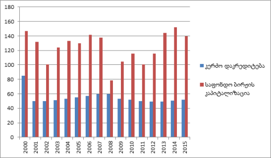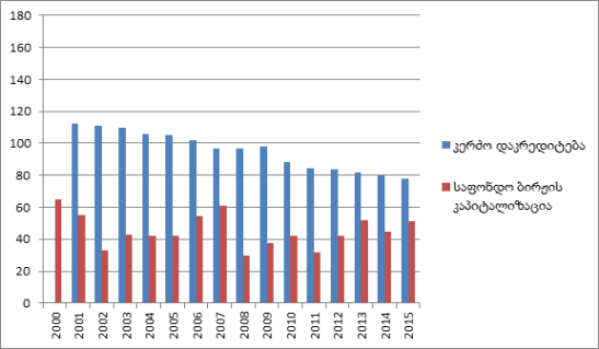 ზემოთ აღნიშნული საბანკო სისტემა იდენტურია საქართველოშიც. წლების განმავლობაში კერძო სექტორის ძირითადი დამფინანსებლები იყვნენ ბანკები, თუმცა ბოლო პერიოდში ოქტომბრის მონაცემებით დაფინანსება შემცირდა 12.5 მილიონით. ამის ერთ-ერთი მიზეზი, ბაზარზე კრედიტორთა რიცხვის შემცირებაა რომელიც წლების წინ დაიწყო და დღემდე გრძელდება. კონკრეტულად, დიდი ბანკები ბაზრიდან გავიდნენ ( ბოლო მონაცემებით Bank Republic შეისყიდა TBC ბანკმა ხოლო ProCredit Bank -საქართველოს ბანკმა შეირწყა) და დარჩნენ წვრილი ბანკები, რომელთა გეგმები გაურკვეველია. არ არის გამორიცხული, რომ მათაც დათმონ პოზიციები და გავიდნენ ბაზრიდან. ამ სიტუაციაში აუცილებელი ხდება სხვა სექტორების აქტიური ხელშეწყობა, საფონდო ბირჟის ამოქმედება, რაც აქამდე არ მოხდა კაპიტალის ბაზრის სახელმწიფოს მხრიდან არაპრიორიტეტულობის გამო.