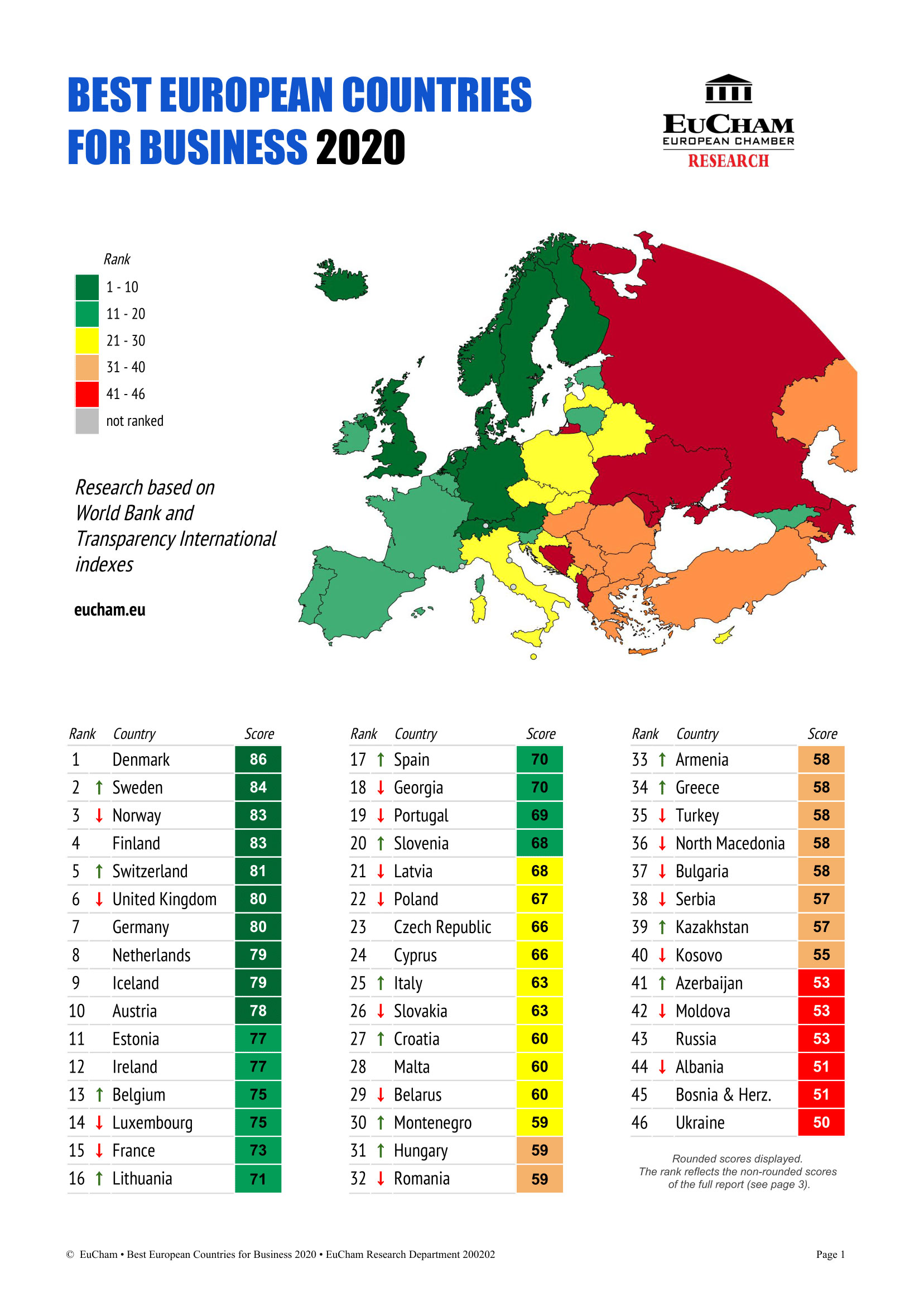 EuCham-ი 46 ევროპულ ქვეყანაში არსებულ ეკონომიკურ გარემოს ყოველ წელს იკვლევს. საინვესტიციო მიმზიდველობით საუკეთესო ქვეყნების გამოსავლენად კვლევაში მსოფლიო ბანკის ბიზნესის კეთებისა და საერთაშორისო გამჭვირვალობის კორუფციის აღქმის ინდექსებია გამოყენებული.