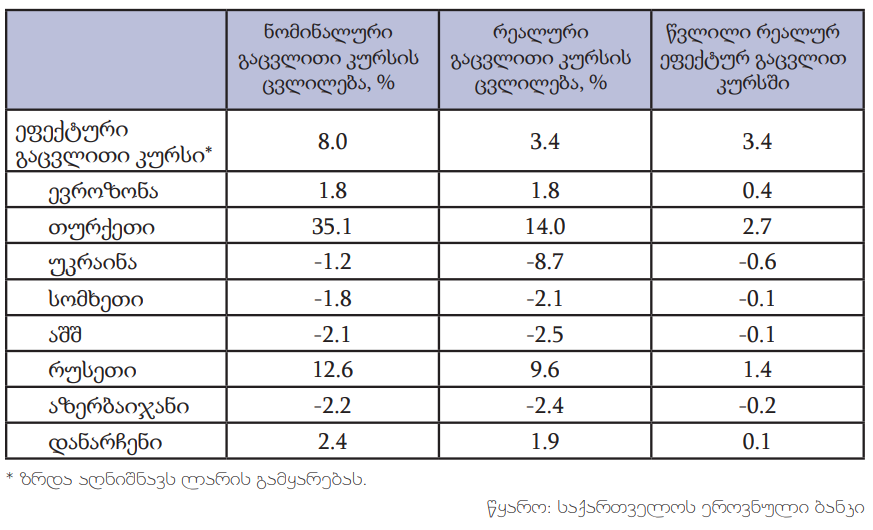 ეროვნული ბანკის მონაცემებით, ამავე პერიოდში ლარის ნომინალური ეფექტური გაცვლითი კურსი კვარტალურად 4.7%-ით გაუფასურდა, ხოლო წლიურად კი 8%-ით გამყარდა. ამავე პერიოდში რეალური ეფექტური გაცვლითი კურსი კვარტალურად 5.5%-ით გაუფასურდა, ხოლო წლიურად კი 3.2%-ით გამყარდა.