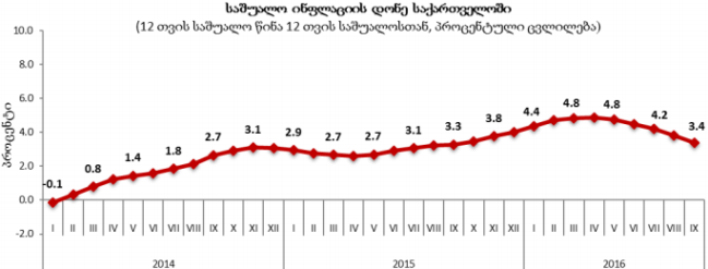 საქართველოს სტატისტიკის ეროვნული სამსახურის ინფორმაციით, სექტემბერში სამომხმარებლო საქონლისა და მომსახურების ფასები 0.3%-ით გაიზარდა, წლიურმა ინფლაციამ (12 თვის) კი 0.1% შეადგინა. წინა თვესთან შედარებით, სექტემბერი ყველაზე მეტად (0.9%-ით) სურსათი გაძვირდა. ფასების მნიშვნელოვანი ზრდა დაფიქსირდა ბოსტნეულისა და ბაღჩეულის (4.4 %), რძის, ყველისა და კვერცხის (4.3 %), აგრეთვე ხილისა და ყურძნის (3.3%) ქვეჯგუფებზე. ყველაზე მეტად გაიაფდა (1%-ით) ტრანსპორტი.
