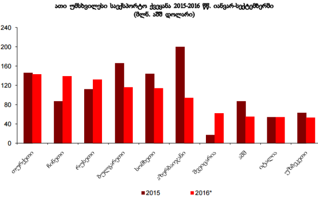 სექტემბერში, 2015 წლის სექტემბერთან შედარებით, ყველაზე მნიშვნელოვანი ზრდა დაფიქსირდა ჩინეთის (12 მლნ დოლარი), ბულგარეთის (10 მლნ დოლარი), რუმინეთის (5 მლნ დოლარი), გერმანიის (4 მლნ დოლარი) და ერაყის (3.7 მლნ დოლარი) მიმართულებით. ხოლო, ექსპორტი ყველაზე მეტად შემცირდა პოლონეთში (3.7 მლნ დოლარი), აზერბაიჯანში (7 მლნ დოლარი), კანადაში (6 მლნ დოლარი), აშშ-ში (5 მლნ დოლარი) და თურქეთში (4.5 მლნ დოლარი).
