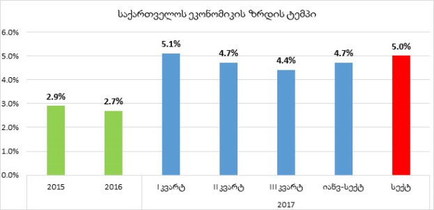 საქართველოს სტატისტიკის ეროვნული სამსახურის წინასწარი შეფასებით, მიმდინარე წლის სექტემბერში, წინა წლის სექტემბერთან შედარებით, საქართველოს ეკონომიკა 5%-ით გაიზარდა. 2017 წლის მე-3 კვარტალში ზრდამ 4.4% შეადგინა, ხოლო პირველი სამი კვარტლის (იანვარ-სექტემბრის) ეკონომიკური ზრდა 4.7%-ია.
