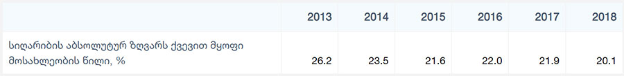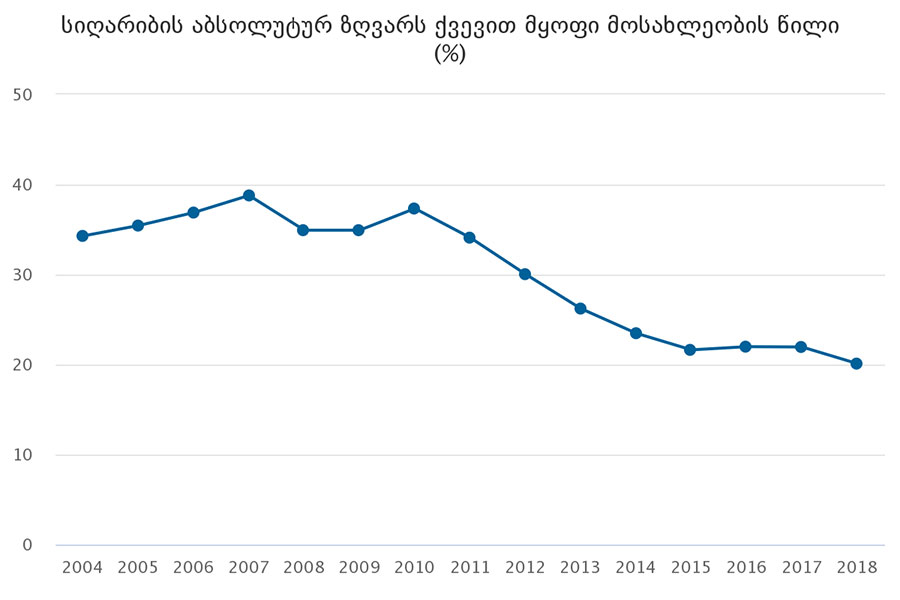 მსოფლიო ბანკის მონაცემებით, 2010 წლიდან 6 წლის განმავლობაში, საქართველოში სიღარიბის მაჩვენებელი მუდმივად მცირდებოდა. 2016 წელს კი საქართველოში სიღარიბის აბსოლუტურ ზღვარს მიღმა მყოფი მოსახლეობის წილი გაიზარდა და 21,3% შეადგინა. 2018 წლის ბოლოს კი 20.1%–მდე შემცირდა.