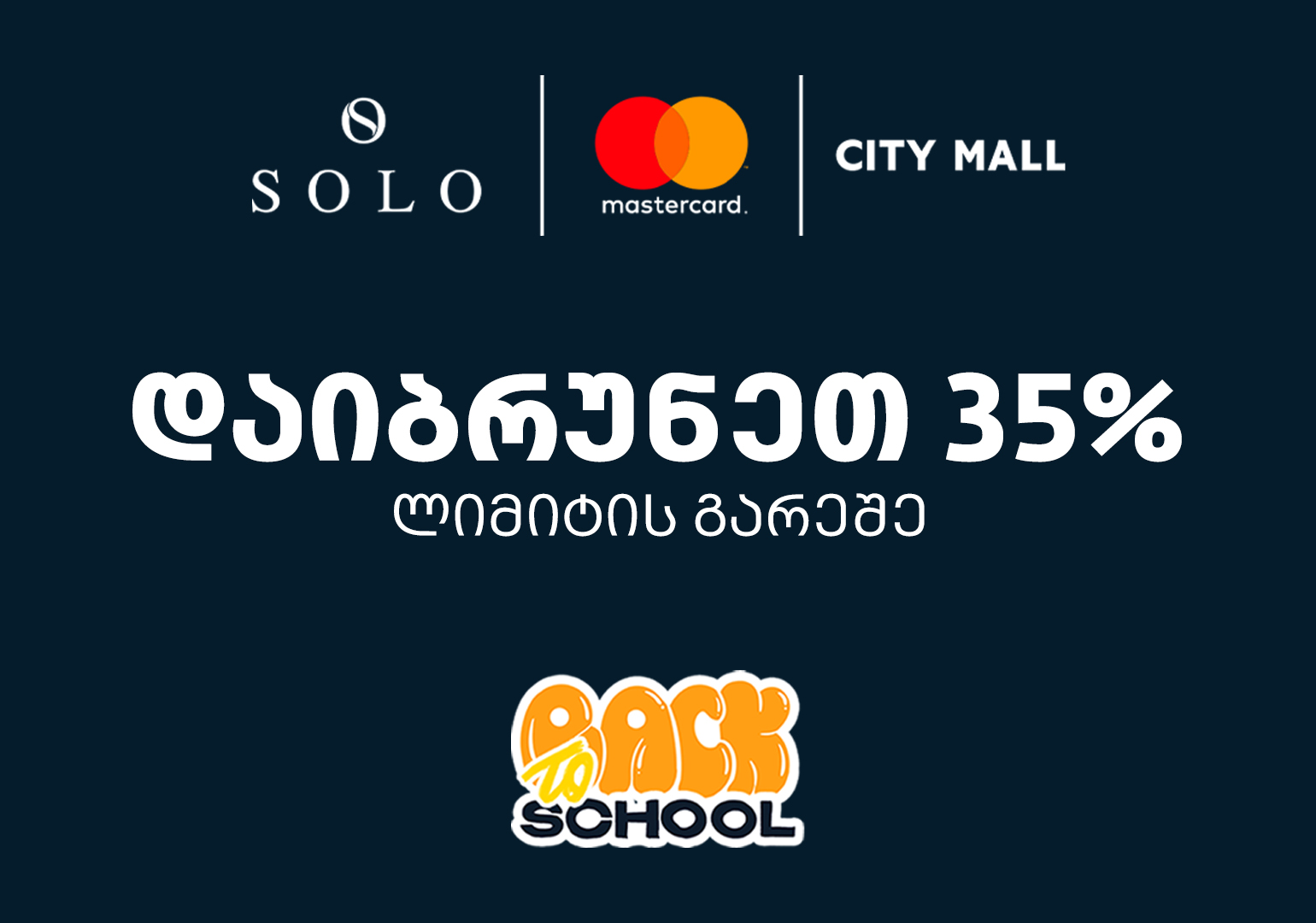 SOLO Back to school კამპანიის ფარგლებში მომხმარებლებს სპეციალურ შეთავაზებას სთავაზობს. 14 სექტემბერს, საბურთალოსა და გლდანის სითი მოლში SOLO Mastercard World Elite ბარათით გადახდისას მომხმარებლები ულიმიტო 35%-იანი ქეშბექით ისარგებლებენ.