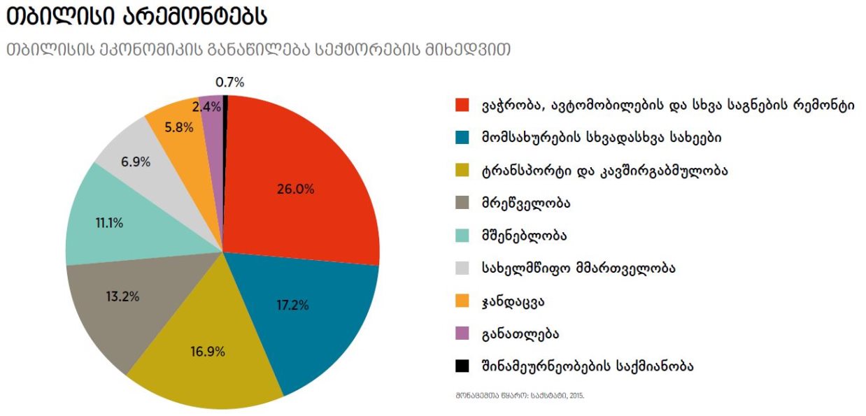 საქართველოს სტატისტიკის ეროვნული სააგენტოს ინფორმაციაზე დაყრდნობით, შეგვიძლია ვნახოთ, თუ როგორ ნაწილდებოდა თბილისის ეკონომიკა სექტორების მიხედვით 2015 წელს. ყველაზე მსხვილი დარგი ვაჭრობა, ავტომობილებისა და სხვა საყოფაცხოვრებო საგნების რემონტია (26%), სადაც 2015 წელს 3.5 მილიარდი ლარის დამატებული ღირებულება შეიქმნა. მეორე ადგილზე მომსახურების სხვა სახეებია (კომუნალური, რესტორნები, სასტუმროები, გართობა, სპორტი და ა.შ.) 2.31 მილიარდი ლარით, ხოლო მესამეზე ტრანსპორტი და კავშირგაბმულობაა 2.27 მილიარდით.