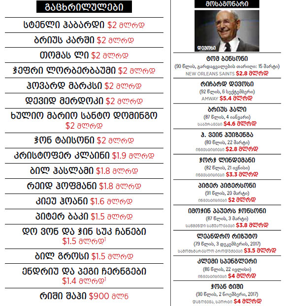 გასულ წელს Forbes 400-ის რეიტინგს ჩვიდმეტი მილიარდერი გამოაკლდა. მათგან სამი განთქმულის ქონებაში საბოლოო ლურსმანი ქორწინებამ, სენდვიჩების შავმა დღემ და ქველმოქმედებამ ჩააჭედა. სხვა მრავალმა უბრალოდ ვეღარ შეძლო ფეხის აწყობა და იმ $2.1 მილიარდს ქვემოთ დარჩა, რომელიც წლევანდელ რეიტინგში მოსახვედრად საჭირო მინიმუმს წარმოადგენდა.