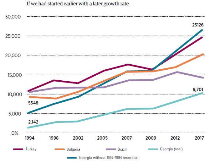 Where would we be now if per capita PPP in Georgia had not decreased catastrophically from 1992-1994 and if in 1994 we had remained on the same level as in 1991. Would everything develop in the same way as it actually did (from 1995-2017 the average growth rate of per capita PPP in Georgia was 7%)? In that case, in 2017, per capita PPP in Georgia would be 2.6 times more (than it actually is) and would reach $25,126 PPP. We would be ahead of Brazil in 2005, Bulgaria in 2007 and beat Turkey in 2012. We could have been closer to Russia and Greece, while as things are now, Georgia is closer to Equator, Kosovo and Swaziland in terms of income rate.