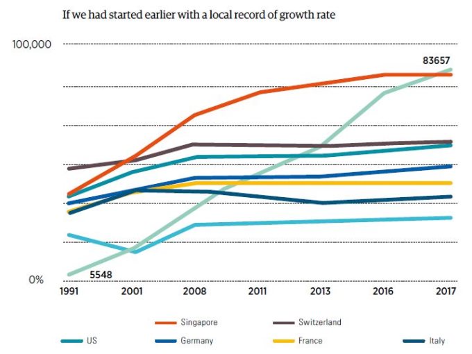 Where would we be now if per capita PPP in Georgia had not decreased catastrophically from 1992-1994 and if in 1994, we had remained on the same level as in 1991, and if then we had a stable annual growth of 11% like we had from 2003-2007. In that case, the per capita PPP in 2017 would have reached $83,657 PPP and the only countries of the world wealthier than Georgia would have been Qatar and Luxemburg. In 2001, we would beat Russia and in 2010-2011 we would be ahead of Italy, France and have caught up with Switzerland. In 2017, we would have forced Singapore to give up third place.