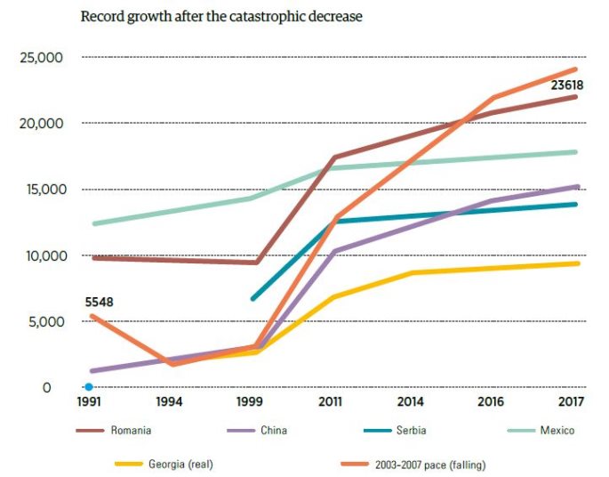 Where would we be now if per capita PPP in Georgia had indeed decreased catastrophicallyin 1992-1994, as it really happened, but if from 1995 we had stable annual growth of 11% like we had from 2003-2007? In that case, the per capita PPP in 2017 would have been $23,618 PPP. In 1999, we would have been ahead of China, in 2011 – Serbia, in 2014 – Mexico and in 2016 – Romania.