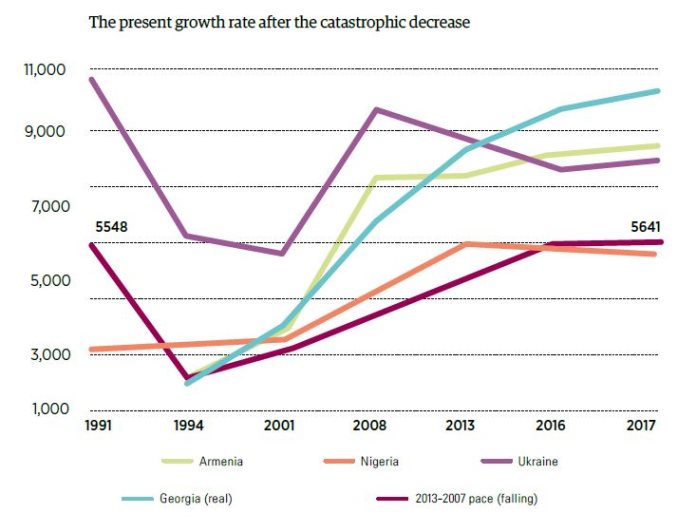Where would we be now, if per capita PPP in Georgia had indeed decreased catastrophically from 1992-1994 and in 1994, had remained on the same level as in 1991, and then from 1994 per capita PPP would have increased at the average economic growth pace of 2013-2017 – 4.3%? In that case, the per capita PPP would have been $5,641 PPP, which is 1.7 times less than the actual figure. From 2000, many countries that are now poorer than Georgia, like Armenia, Nigeria and others would be ahead of us