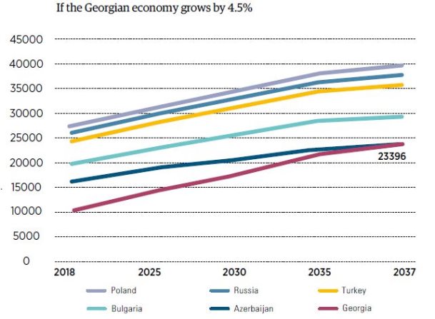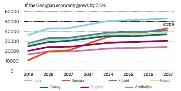 If the economy of Georgia (hence, the per capita PPP) grows by 7.5% annually, in 2037, per capita PPP would be $41,209 PPP. In 2027, we would be ahead of Azerbaijan, in 2031 – Bulgaria, which is currently considered the country with the lowest income in the EU, in 2035 – Turkey, in 2036 – Russia and in 2037 – Poland.