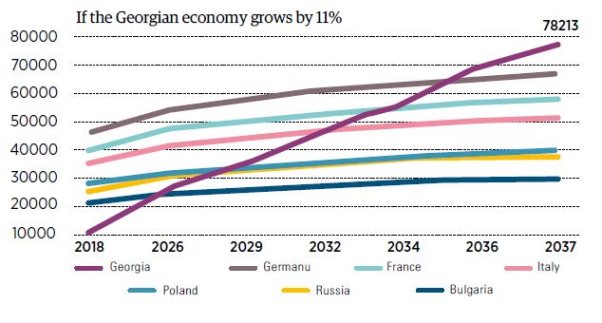 If the economy of Georgia (hence, the per capita PPP) grows by 11% annually, in 2037, per capita PPP would be $78,213 PPP. From 2026, we would be ahead of Bulgaria, in 2029 – Russia and Poland, in 2032 – Italy, 2034 – France and 2036 – Germany.